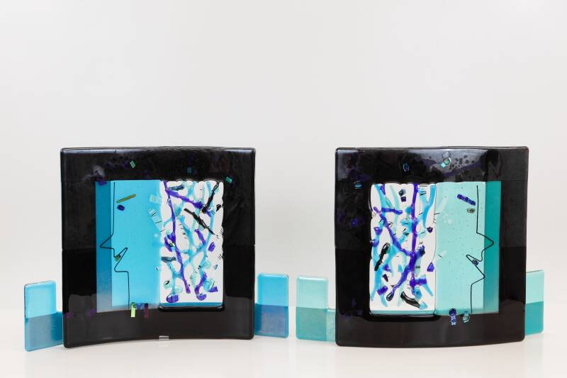'We are sailing’, 52 x 48 x 12,5 cm, Fused Bullseye glass in a frame of steel: € 790,--